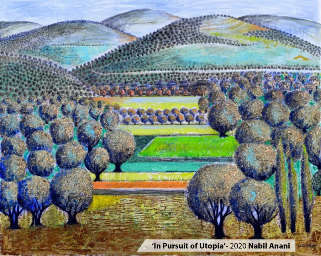 नबील के चित्र उम्मीद से भरे हैं। उनके उनकी पेंटिंग्स में ख्वाब हैं एक पुरसुकून सुबह के, ख्वाब हैं जैतून के दरख्तों के और ख्वाब हैं अमन और शांति के। उनकी पेंटिंग्स रंगों से भरी हैं। उनकी एक पेंटिंग ‘यूटोपिया की तलाश’ (In Pursuit of Utopia) का जिक्र किया जा सकता है। इस पेंटिंग में दूर क्षितिज तक फैले जैतून के बाग हैं। ऐसा लग रहा है जैसे कलाकार ने खुशियां बिखेर दी हों।