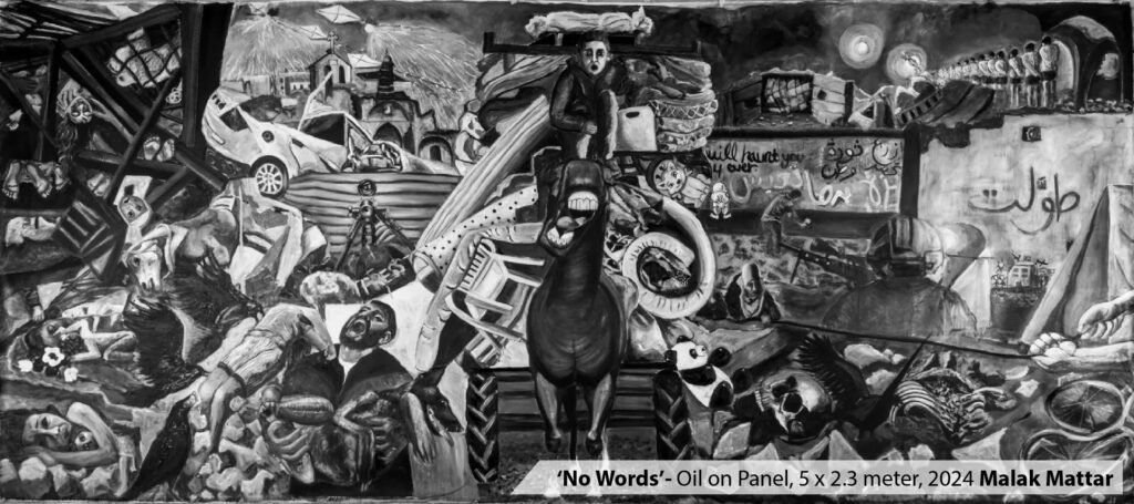 मलक मत्तार की पेंटिंग ‘नो वर्ड्स’ युद्ध और आतंक की तबाही को फिर से जीती है जिसके चलते गाज़ा और फ़लस्तीन के और हिस्सों में 80,000 से ज्यादा मौतें हो चुकी हैं। मलक मत्तार कहती हैं, ‘मैं गाज़ा स्ट्रिप में बड़ी हुई हूं। मेरा हमेशा से मानना रहा है कि फ़लस्तीन में भरपूर जीवन है लेकिन त्रासदी यह कि लोग जीने के लिए छटपटा रहे हैं।‘